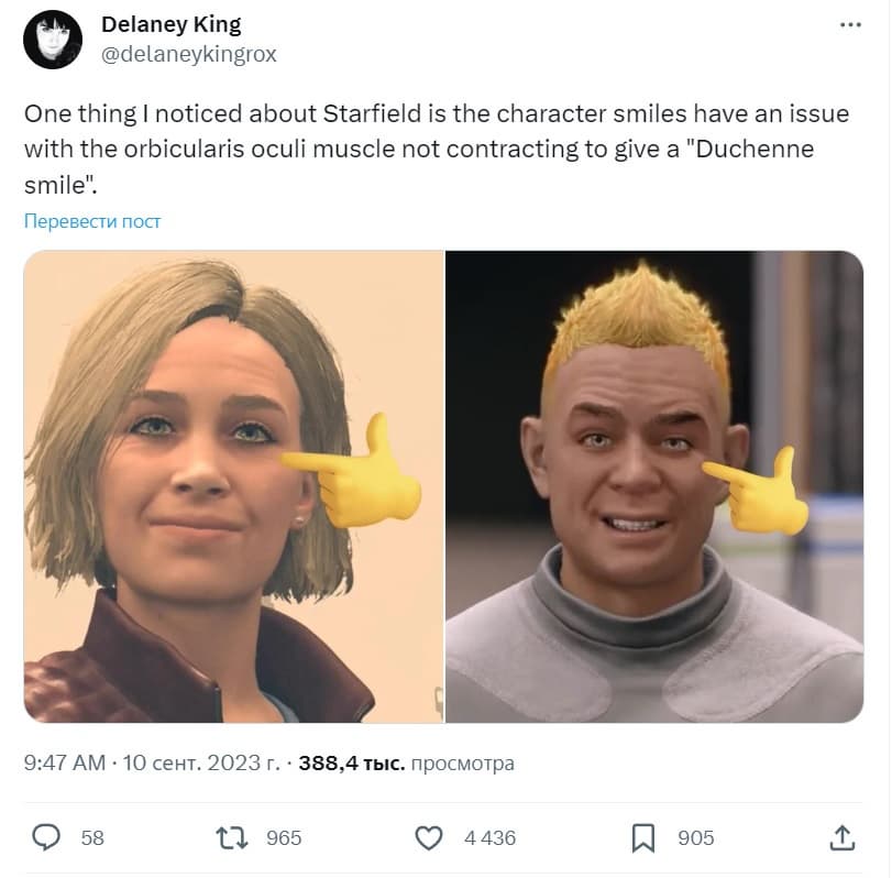 Анализ Дилейни Кинг позволяет предположить, что в этом кроется основная причина неестественной мимики «мёртвых внутри» персонажей Starfield. Наиболее заметно отсутствие анимации круговых мышц глаз, которые будет легко устранить, если у Bethesda дойдут руки.