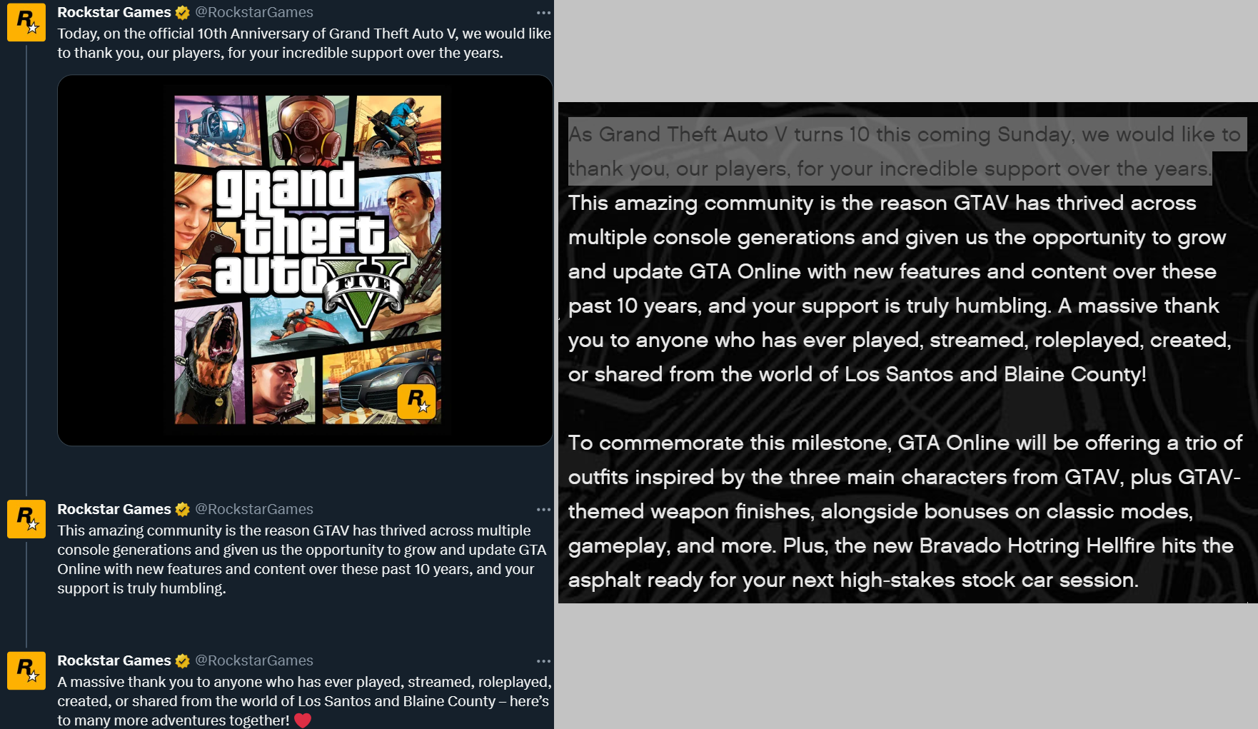Зоркие персоны заметили, что свежее обращение Rockstar Games к сообществу подозрительно напоминает пост трёхдневной давности. Внесли минимум изменений и дополнили текст сердечком в конце.