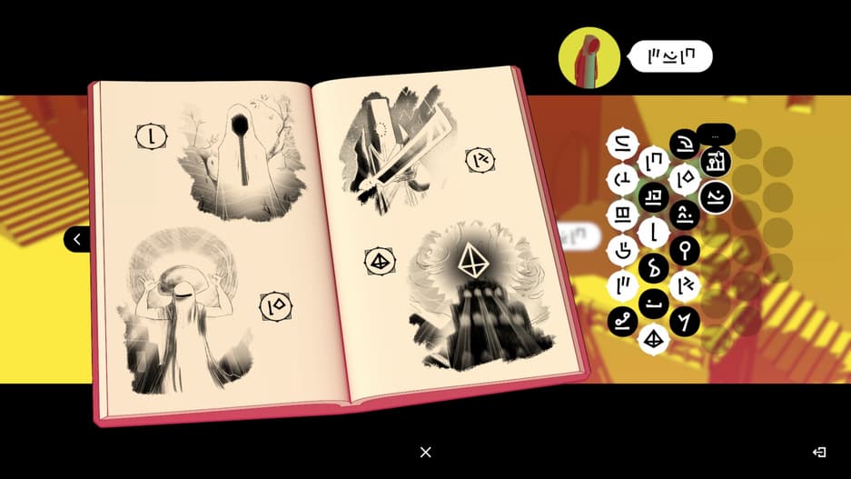 Объяснение кода, даже неправильное, можно написать самостоятельно или подождать, когда игра предложит его в виде рисунка. Смысл слова можно понять с помощью дедукции, исключения, интуитивно, исходя из написания знака, либо методом примитивного подбора. После занесения перевода в дневник, слово заполнит пробел в предложениях, упростив понимание того, что нужно делать и куда двигаться дальше.
