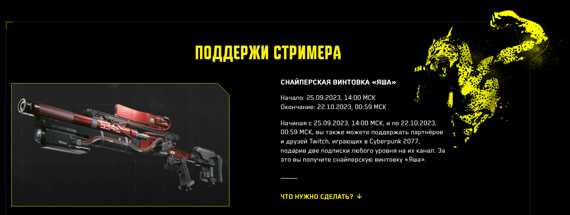 Не обошлось и без нюансов, не все подарки можно получить бесплатно: для желающих поддержать стримеров деньгами тоже предусмотрели награду. Можно будет заполучить Снайперскую винтовку «Яша», для этого надо подарить две подписки любого уровня на канал стримера-партнёра CDPR. У акции региональные ограничения, например Россия в списке участников не указана.