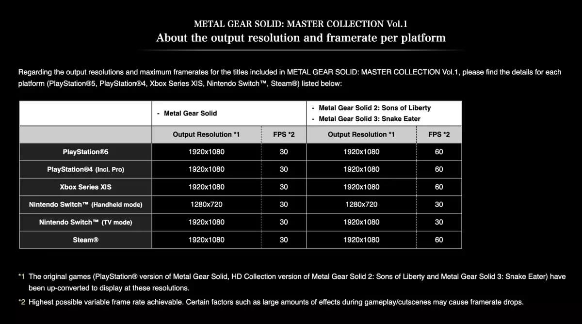Konami представила полную разбивку данных о разрешении и частоте по конкретным платформам. На Nintendo Switch различные части Metal Gear Solid действительно будут воспроизводиться с частотой 30 кадров в секунду - в портативном режиме разрешение составит 1280х720, а при подключении к телевизору - 1920х1080.