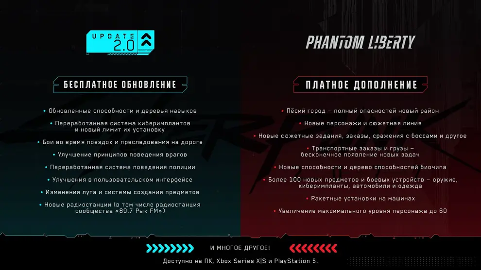 В Cyberpunk 2077 2.0 основательно перекроили многие игровые системы: появилась боёвка на транспорте, улучшили принципы поведения врагов, обновили способности и деревья навыков, переработали полицию и не только. 26 сентября ожидается релиз платного дополнения Phantom Liberty, которое ещё больше расширит игру.