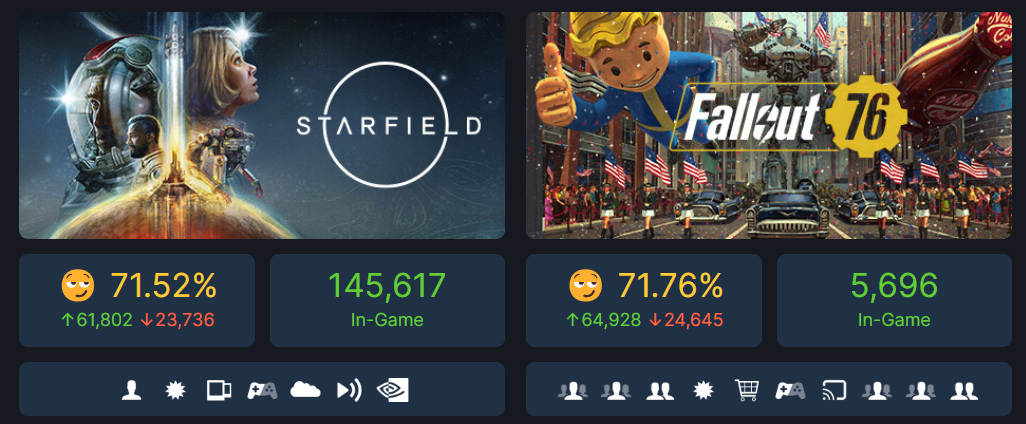 Судя по данным SteamDB сложилась такая ситуация, что рейтинг Starfield уже опустился ниже Fallout 76.