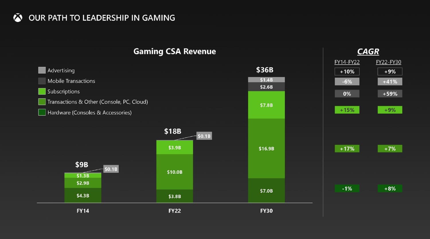 По оценкам Microsoft, к 2030 году стоимость Xbox может составить 36 млрд долларов, что будет обусловлено в первую очередь продажами игр, микротранзакциями и покупками на консоли, ПК и в «облаке». Более того, Microsoft ожидает, что к 2030 году Xbox заработает на транзакциях 16,9 млрд долларов.