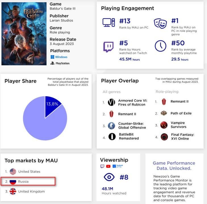 Аналитическая компания Newzoo провела расследование, результаты которого показали, что Россия занимает второе место по числу активных пользователей за месяц (MAU) в Baldur's Gate 3, уступая только США. Третье место занимает Великобритания.