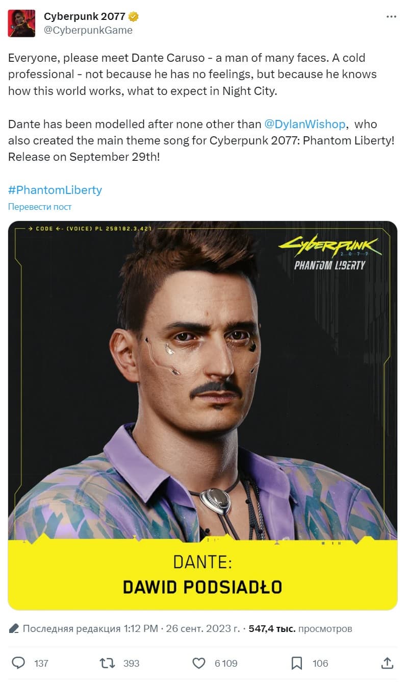 В дополнении Phantom Liberty есть побочное задание с названием In the Right Direction, которое само по себе станет станет ключом к личности таинственного музыканта. Получив телефонный звонок от мистера Хэндса и выполнив задание, игрок встречается с неким Данте Карузо, персонажем, которого играет Давид Подсядло (796 тысяч подписчиков на YouTube, у самой популярной песни 53 млн просмотров).