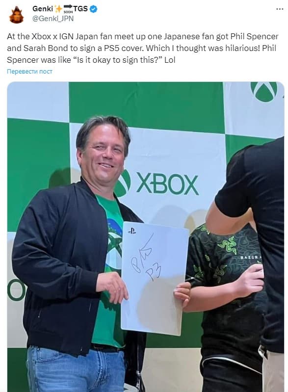 «Во время встречи фанатов Xbox x IGN Japan один японский фанат заставил Фила Спенсера и Сару Бонд расписаться на панели PS5. Это было просто уморительно! Фил Спенсер спросил "Могу ли я подписать её?". Ржу не могу»