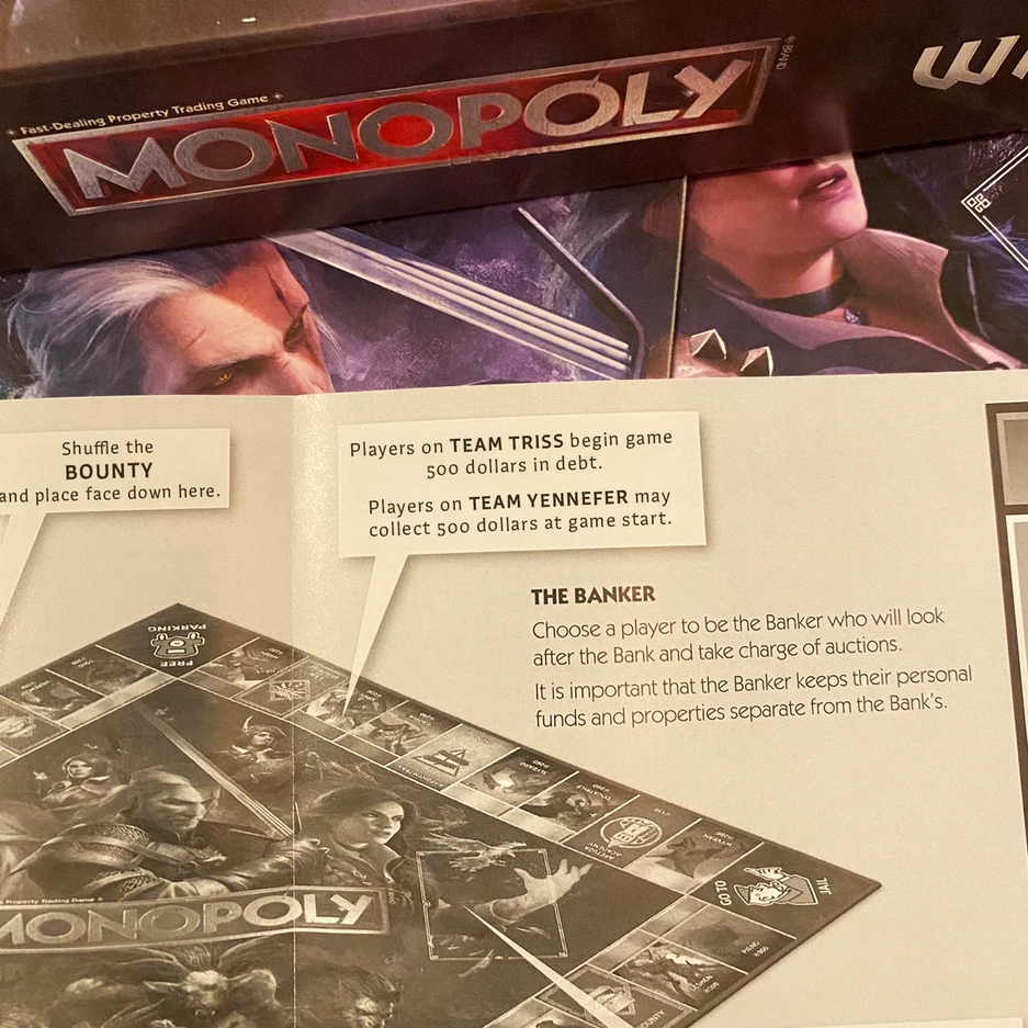 Перед началом партии в Монополию по The Witcher необходимо сделать выбор между Йеннифер и Трисс — отдавшие предпочтение Йеннифер получат бонус $500, а вот если решили примкнуть к команде Трисс, то на них повесят долг в размере $500.