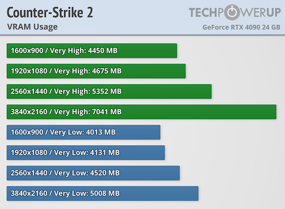 Сколько VRAM использует Counter-Strike 2 при разном разрешении: на очень высоких (зелёный цвет) и очень низких настройках (синий).