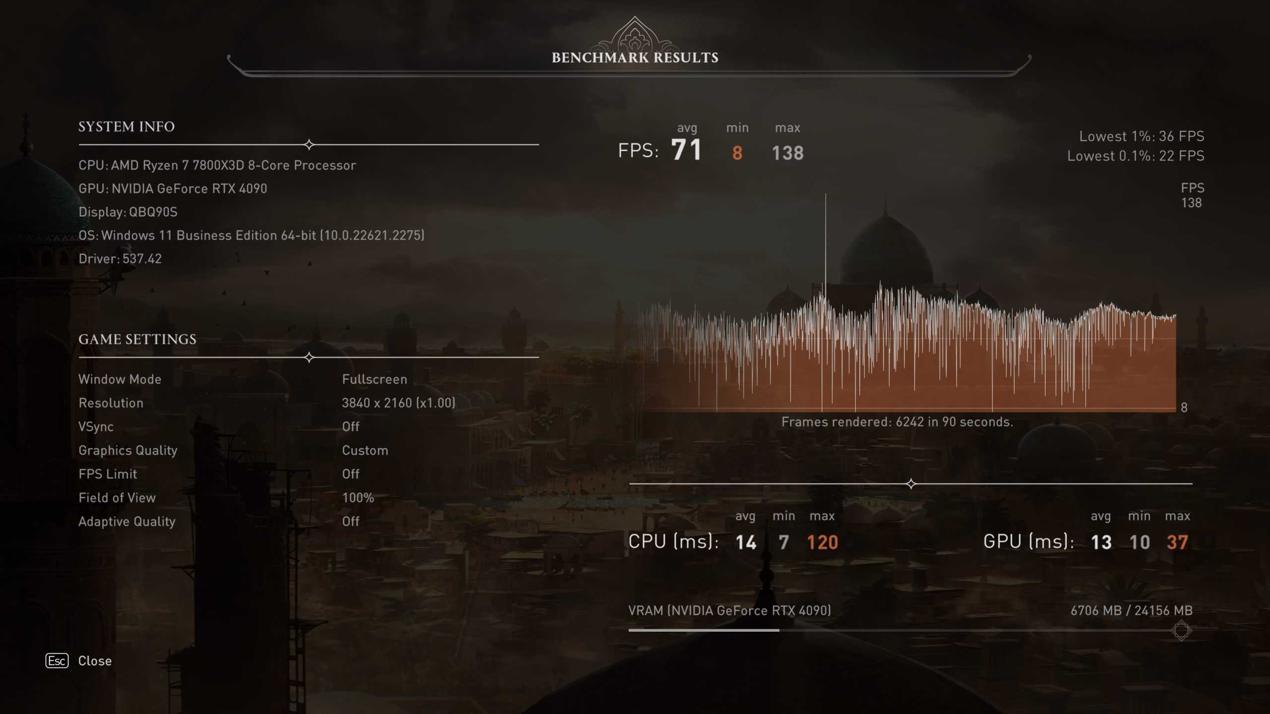 На ПК с NVIDIA GeForce RTX 4090 и AMD Ryzen 7 7800X3D провели тестирование Assassin’s Creed Mirage, результат следующий. На Ultra-настройках с NVIDIA DLSS в режиме качество в среднем выдаёт 71 FPS.