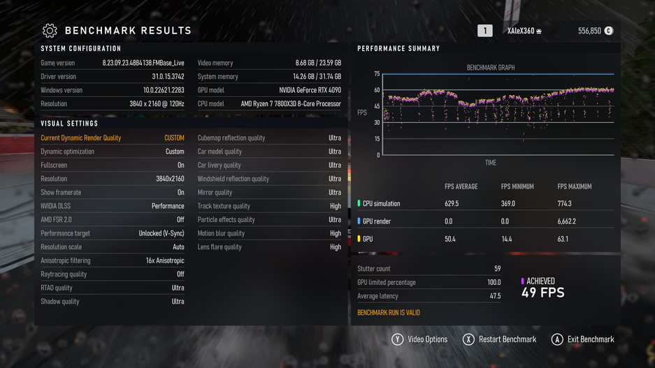 Даже в сочетании с NVIDIA DLSS в режиме производительности Forza Motorsport не выдаёт желанные 60 FPS на максимальных настройках с трассировкой лучей (апскейл с 1080p до 4К). Примечательно, что отключение трассировки позволяет получить дополнительные ~10 кадров, но при этом значительно возрастает число статтеров («заиканий»).