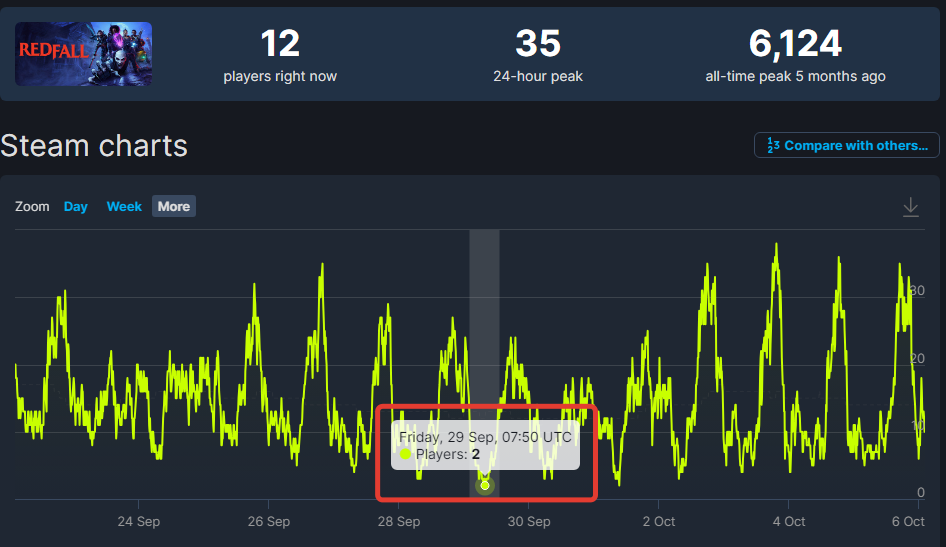 Вампирский шутер Redfall переживает не лучшие времена: если на старте пиковый онлайн игры превышал 6 тысяч одновременно активных пользователей, то на момент написания этих строчек охотой на вампиров промышляют всего 12 человек. И это не самый нижний предел; 29 сентября в определенный момент в Redfall играло всего 2 человека.