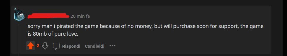 Внимание разработчика Michele Pirovano привлёк комментарий одного из таких пиратов: тот признался, что сейчас нет денег на приобретение игры, но скоро купит, чтобы поддержать автора — разработчик остался доволен.