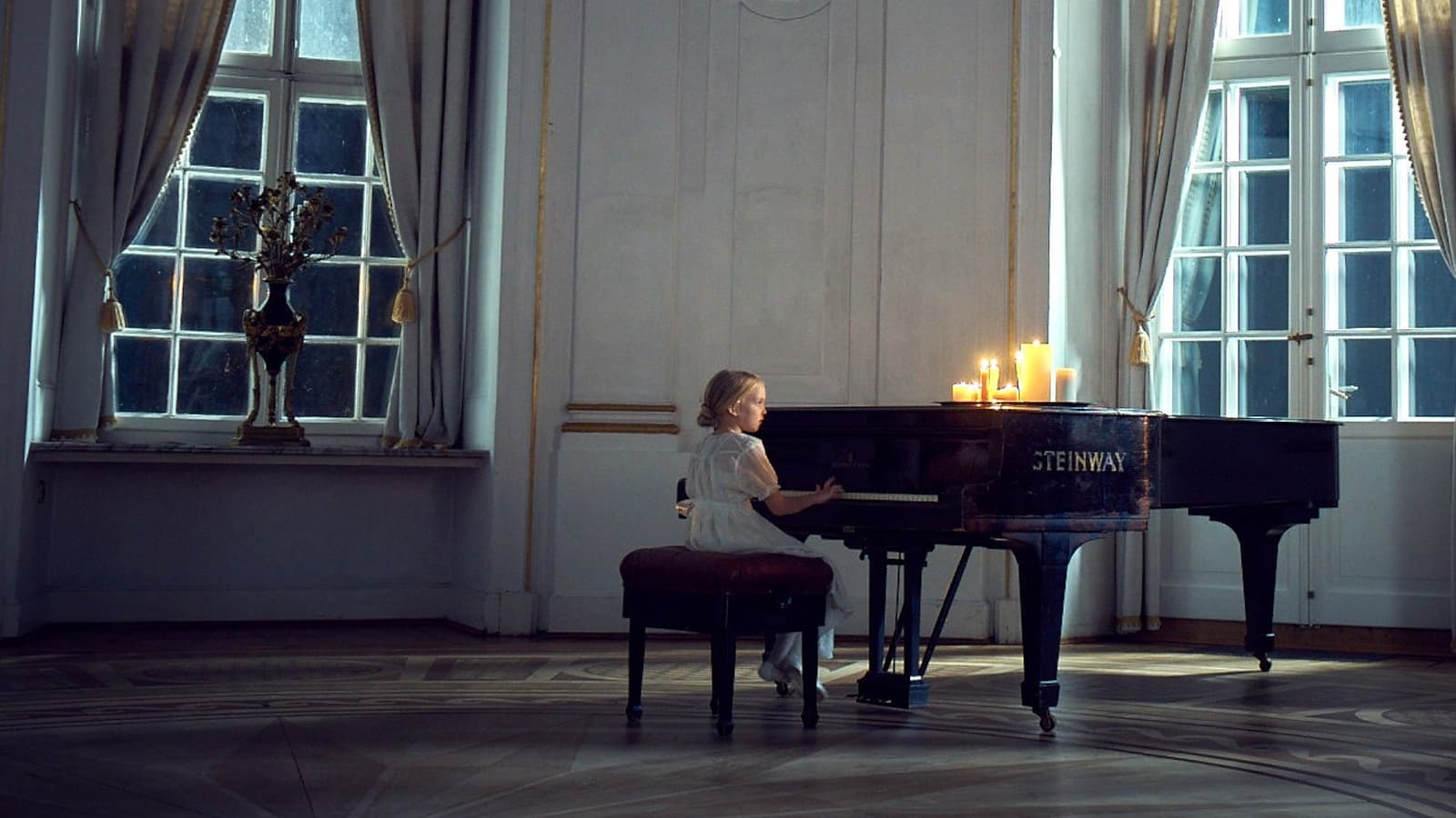 За окнами ночь или поздний вечер, а декор позволяет предположить, что на картине изображен интерьер дворца, изысканного отеля или поместья богатого человека. Пианино Steinway выпускается с 1853 года, и образцу, изображенному на картине, явно много лет. Кроме свечей, в комнате присутствуют электрические лампы, стилизованные под подсвечники, так что действие, скорее всего, происходит в XX веке, но точно определить, в каком именно десятилетии, сложно. В окне слева что-то отражается, но что именно - сказать трудно.