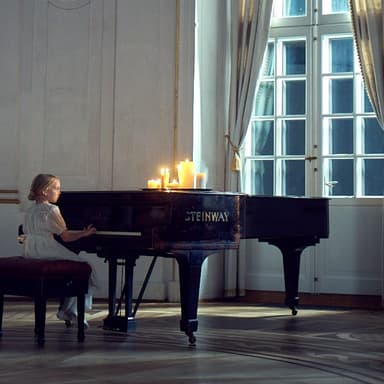 К сообщению прикреплена реалистичная картина или фотография, на которой изображена девушка со светлыми волосами, играющая на рояле Steinway & Sons в элегантной и высокой комнате.