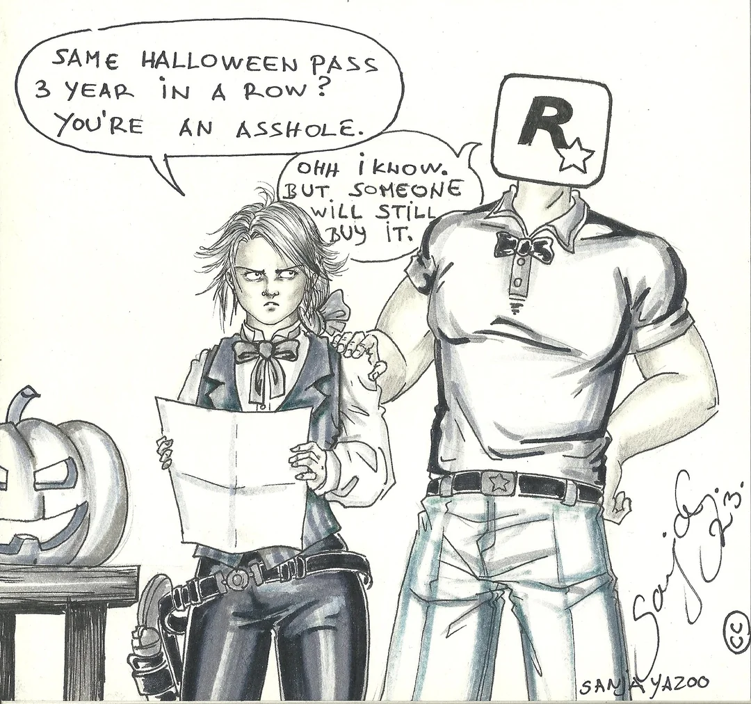 Художник SanjaYazavacc посвятил этому событию картину: типичный игрок в Red Dead Online (слева) и Rockstar Games (справа).