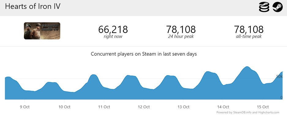 Игроки хлынули в Hearts of Iron 4 и постепенно онлайн начал подрастать (релиз DLC + обновили многие моды). В результате удалось установить новый рекорд онлайна в Steam — 78 108 игроков (или 78 086). Последний раз 70+ тысяч удалось набрать в октябре 2022 года.