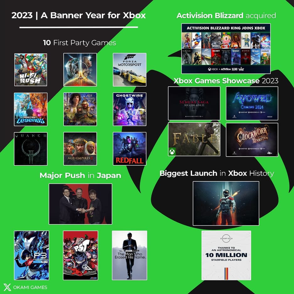 В 2023 году всё по-другому: уже в январе Microsoft неожиданно выпустила Hi-Fi Rush. Следующими стали две части Age of Empires, ещё одна Minecraft, Ghostwire Tokyo с крупным обновлением и три ААА-проекта - Redfall, Forza Motorsport и Starfield.