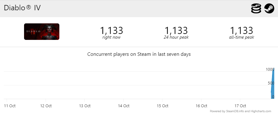 По состоянию на 18 октября, полночь (МСК) онлайн Diablo 4 в Steam не очень большой, чуть больше 1 тысячи игроков. Релиз задержали + не было предзагрузки.