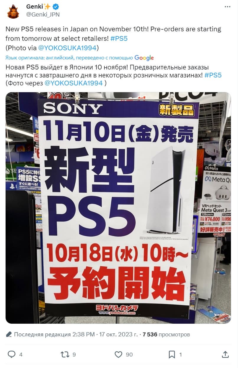 Sony в своем официальном заявлении сообщала, что PS5 Slim будет в продаже в некоторых розничных магазинах в США в ноябре. Ожидается, что производитель предложит устройство на других рынках в «последующие месяцы», но, похоже, японцы также получат возможность поиграть на обновленной PlayStation уже в ноябре.