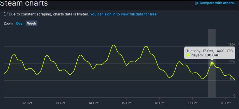 По данным SteamDB, за последние 24 часа число игроков в Cyberpunk 2077 превысило 100 046 человек. А за последние семь дней игра ежедневно достигала пика в более чем 100 тысяч одновременных игроков.