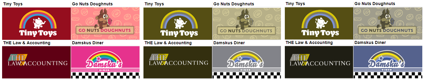 При дизайне учли особенности восприятия цветов: вот так выглядят логотипы, проверенные на Deuteranopia (неспособность воспринимать оттенки зеленого спектра) и Protanopia (невозможность различать красный).