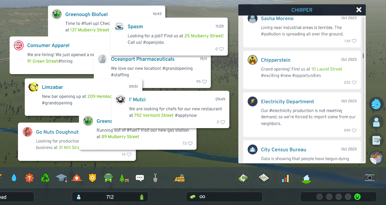 В Cities Skylines 2 действует нечто вроде социальной сети, жители могут сообщать о проблемах. Компании тоже будут высказываться, например о переезде, вакансиях и т.п.