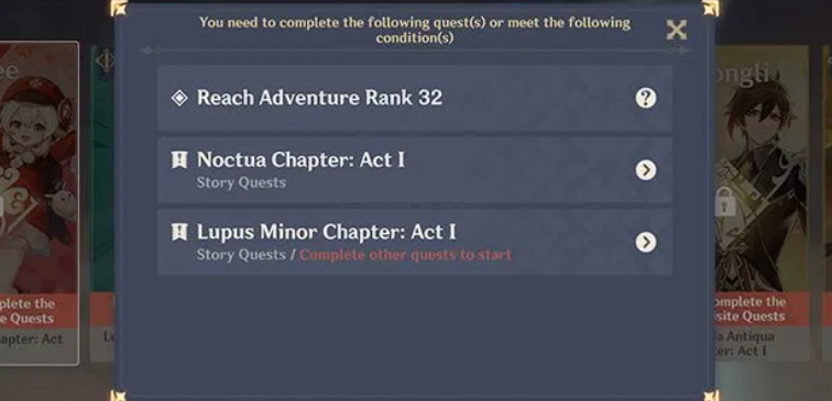 Если у заданий легенд и встреч есть предварительные условия, то после нажатия кнопка должно появиться диалоговое окно с контентом, который требуется пройти.