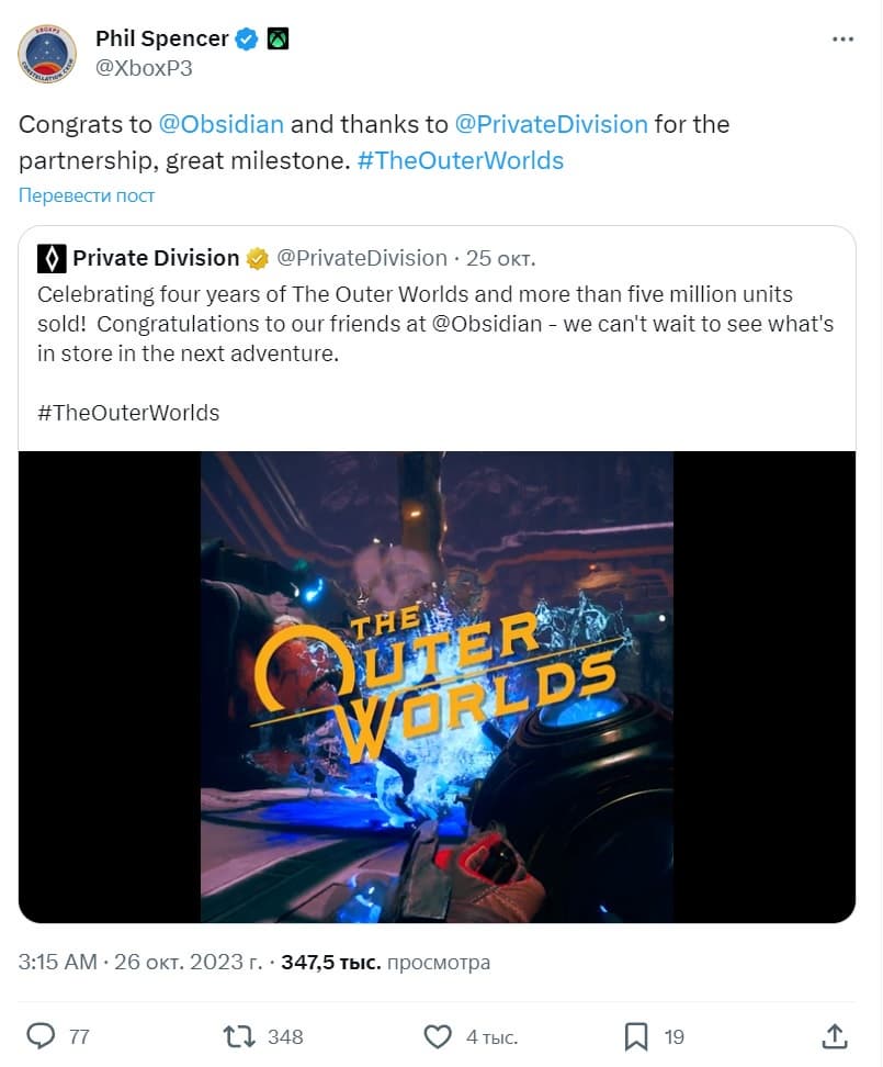 «Поздравляем Obsidian и благодарим Private Division за это сотрудничество, отличное достижение», - написал Фил Спенсер на сообщение издателя о реализации пяти миллионов копий The Outer Worlds.