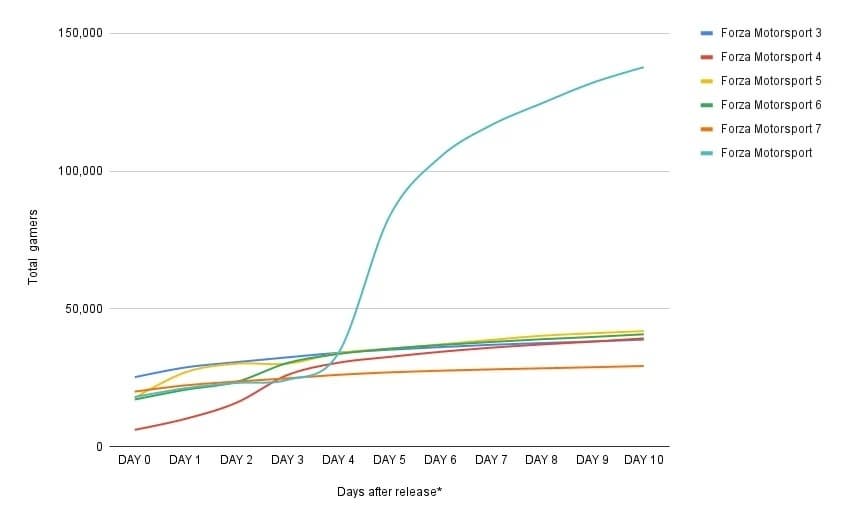 Редакция, используя данные о достижениях, сообщает, что в гонки, стартовавшие в 2009 году, на старте играли 25 228 участников TA (TrueAchievements), в то время как интерес к новой игре был гораздо выше в начале октября: 83 364 участника TA разблокировали первое достижение в Forza Motorsport в день запуска.