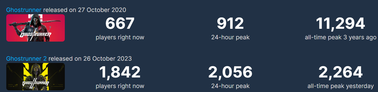 Однако Ghostrunner 2 пока не удалось повторить успех оригинала. В Steam состоялся релиз новинки и пиковый онлайн достиг 2 264 игроков. Для сравнения, оригинальная Ghostrunner привлекла 11 294 игроков.