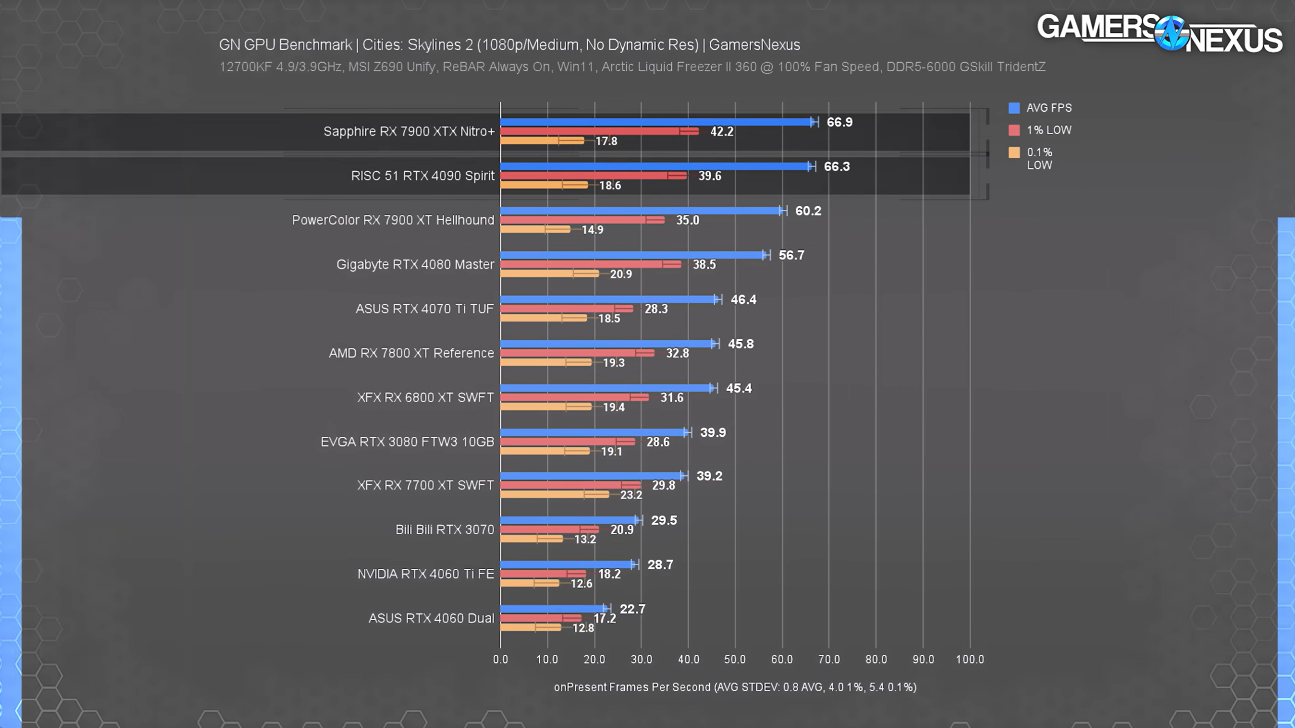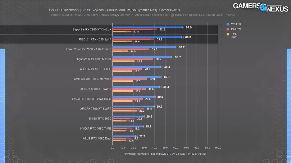 Пример тестов Cities Skylines 2 в 1080p на средних настройках — с RTX 4090 вполне можно увидеть падение ниже 20 FPS.