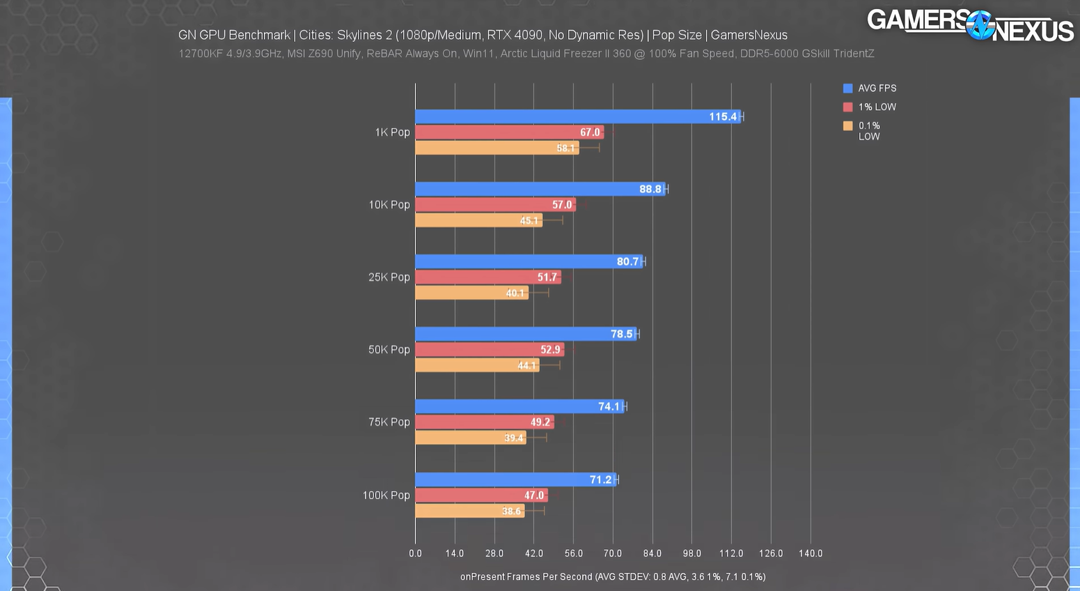 На Gamers Nexus обратили внимание на Cities Skylines 2 и решили испытать десятки видеокарт. Ожидаемо, что чем больше будет жителей, тем сильнее игра начинает подлагивать. Однако исследователи всё же выявили неочевидный момент: падение частоты кадров между 1 и 10 тысячами жителей получилось больше, чем между 10 и 100 тысячами.