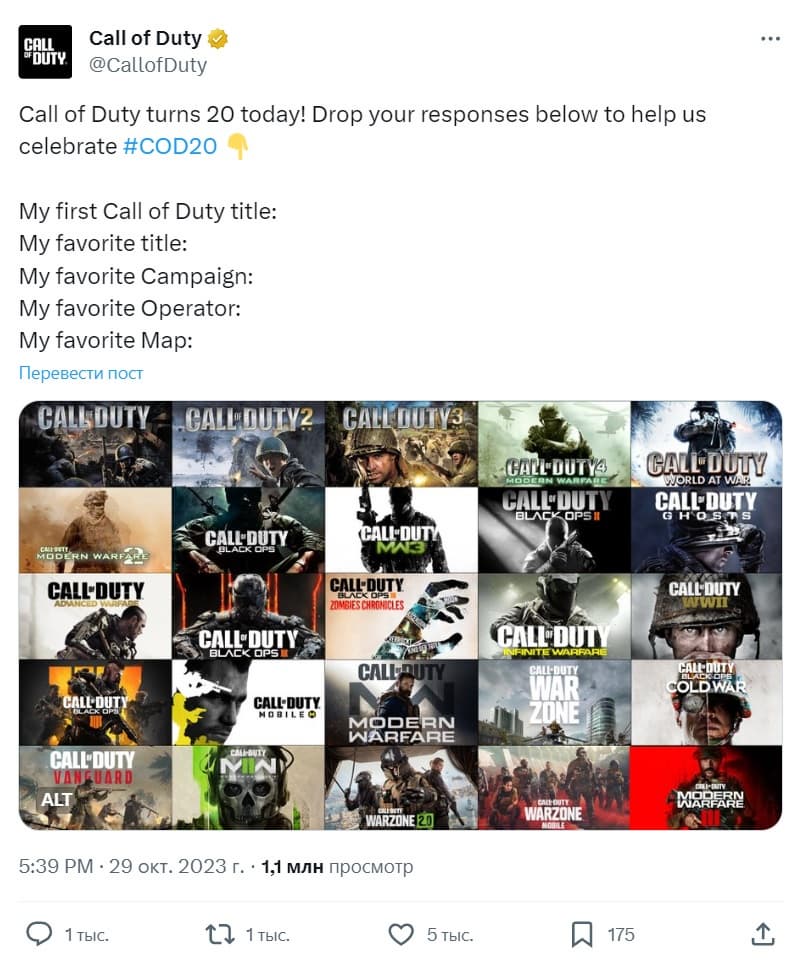 «Сегодня Call of Duty исполняется 20 лет! Введите свои ответы ниже, чтобы помочь нам отпраздновать #COD20