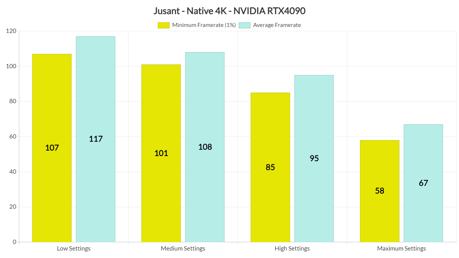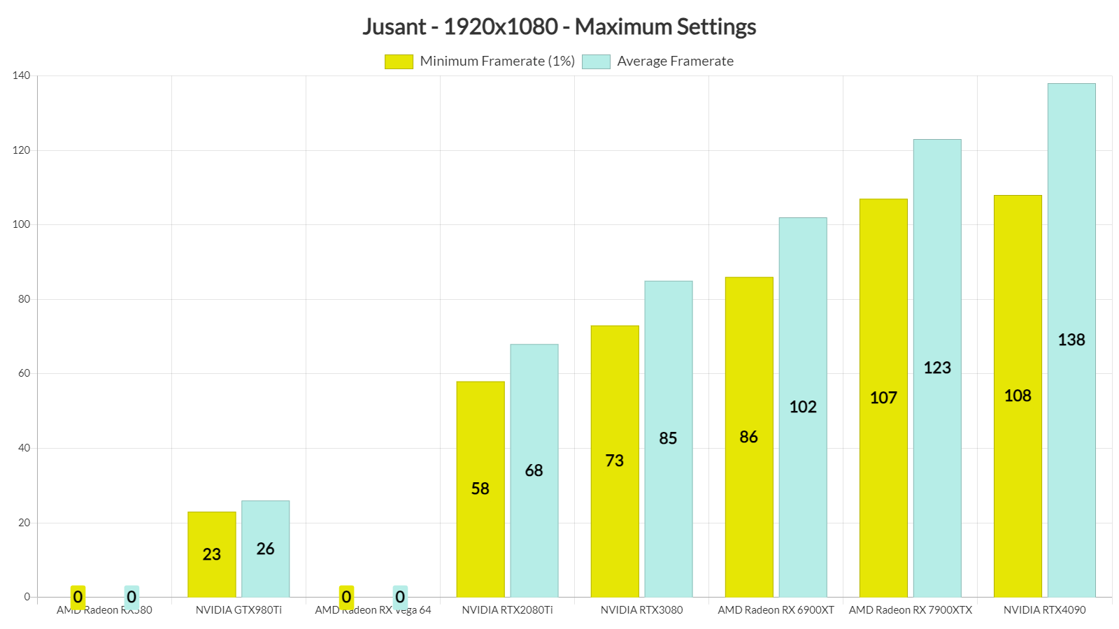 Jusant оказалась удивительно прожорливой игрой: 60+ FPS в 1080p при максимальных настройках можно получить на видеокарте уровня RTX 2080Ti. Если рассматривать вариант с игрой в 4К, то придётся доставать RTX 4090 (и даже эта видеокарта с трудом справляется). На видеокартах MD Radeon RX580 и Vega 64 игра постоянно вылетала.