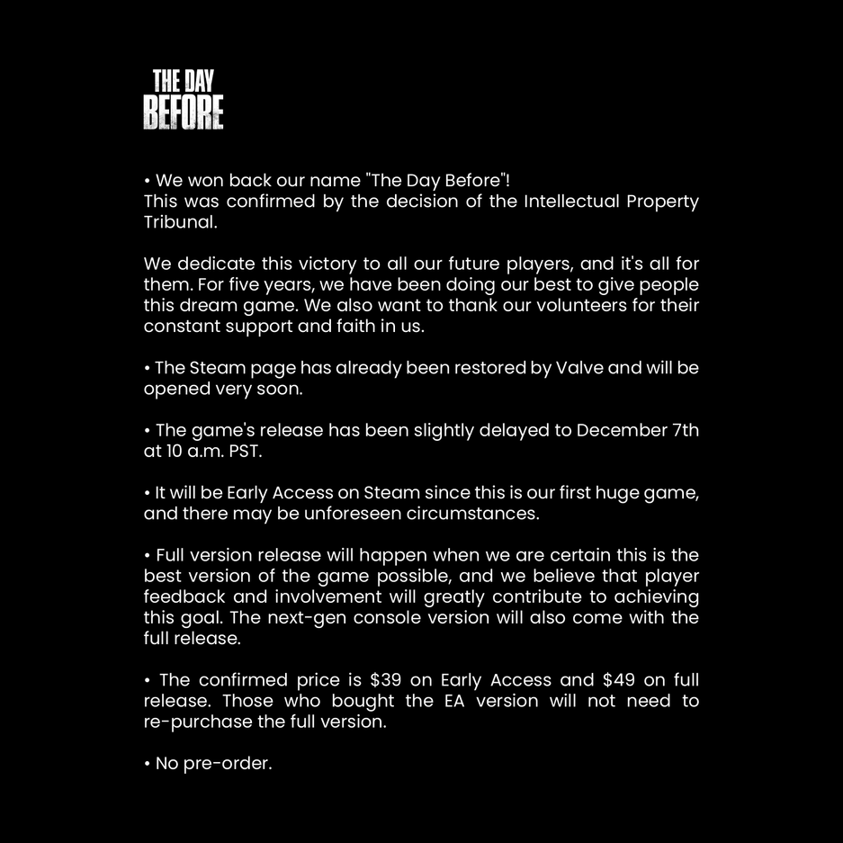 «Мы вернули себе название "The Day Before". Это подтверждено решением суда по [правам на] интеллектуальную собственность.