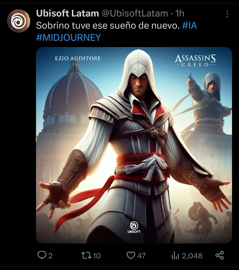 В аккаунте латиноамериканского подразделения Ubisoft факт использования нейросетевого арта не скрывался, был указан соответствующий хештег #Midjourney. Впоследствии пост убрали.
