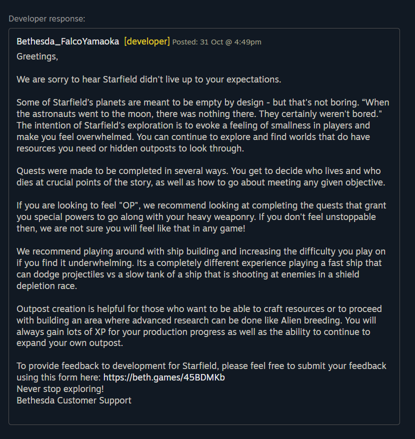 Внезапно Bethesda ответила ему: геймеру объяснили, что некоторые планеты задумывались пустыми, но это не скучно. Проводят аналогию с настоящими астронавтами: им определённо было не скучно в процессе исследования, хотя на Луне ничего не было. Starfield задумывалась так, чтобы исследование заставляло игрока ощущать себя маленьким (в большой вселенной).