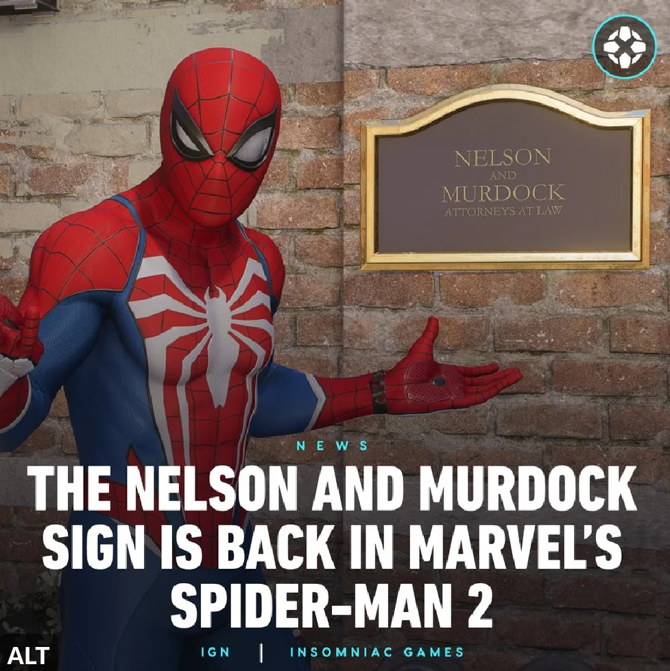 Игроки в Marvel’s Spider-Man 2 заметили, что в сиквеле есть табличка на месте офиса Сорвиголовы (Мэтт Мердок), но она пустая, словно герой куда-то переехал. Творческий директор Брайан Интихар (Bryan Intihar), когда его об этом спросили, ответил что-то в духе «ждите новостей».