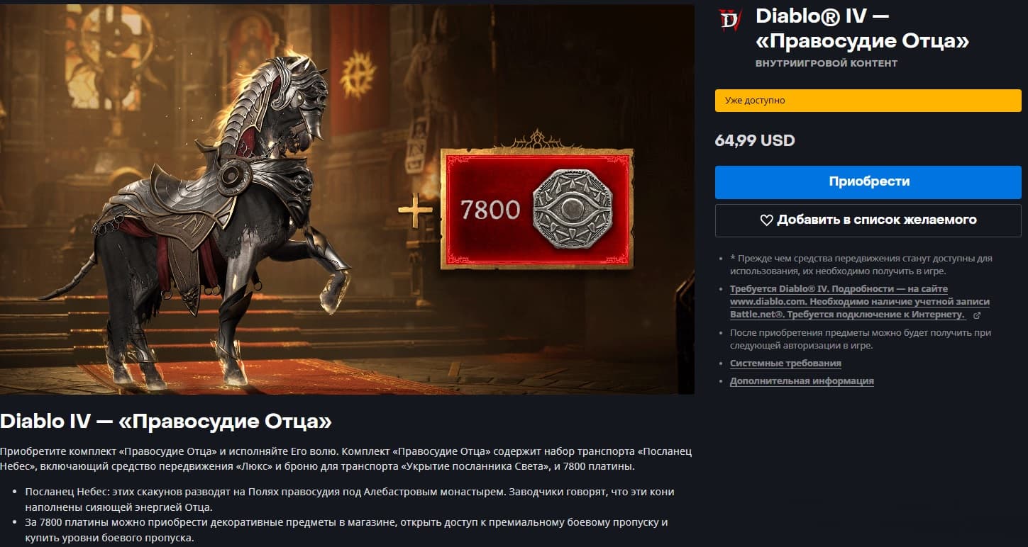 Он состоит из лошади «Посланец Небес» и 7800 платины. Желающим необходимо подготовить 65 долларов. Подразумевается, что сам облик по отношению к стоимости валюты во внутриигровом магазине стоит менее 10 долларов. Но купить отдельно такую красоту нельзя, поэтому в будущем валюту можно использовать на покупки других обликов и игровых преимуществ.