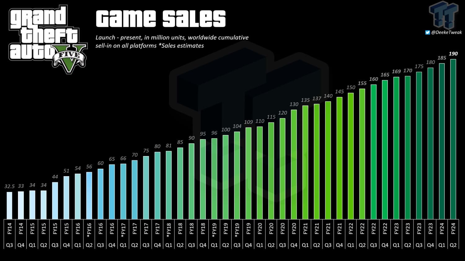 Таким образом, общий объем продаж франшизы GTA достиг 410 млн. экземпляров, и GTA V продается по 5 млн. копий в квартал уже 4 квартала подряд.