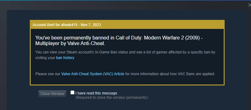 Дело в том, что в Steam он получил уведомление об этом самом VAC бане в Call of Duty Modern Warfare 2 (2009) — очень удивился столь запоздалому сообщению об уже полученной блокировке.