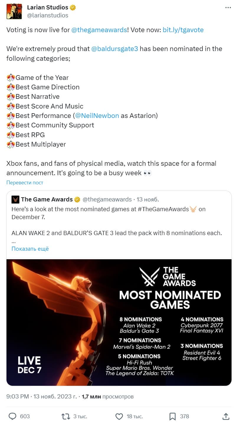 У Baldur's Gate 3 есть шансы получить множество наград, включая звание «Игра года». В сообщении в Twitter/X студия добавила:
