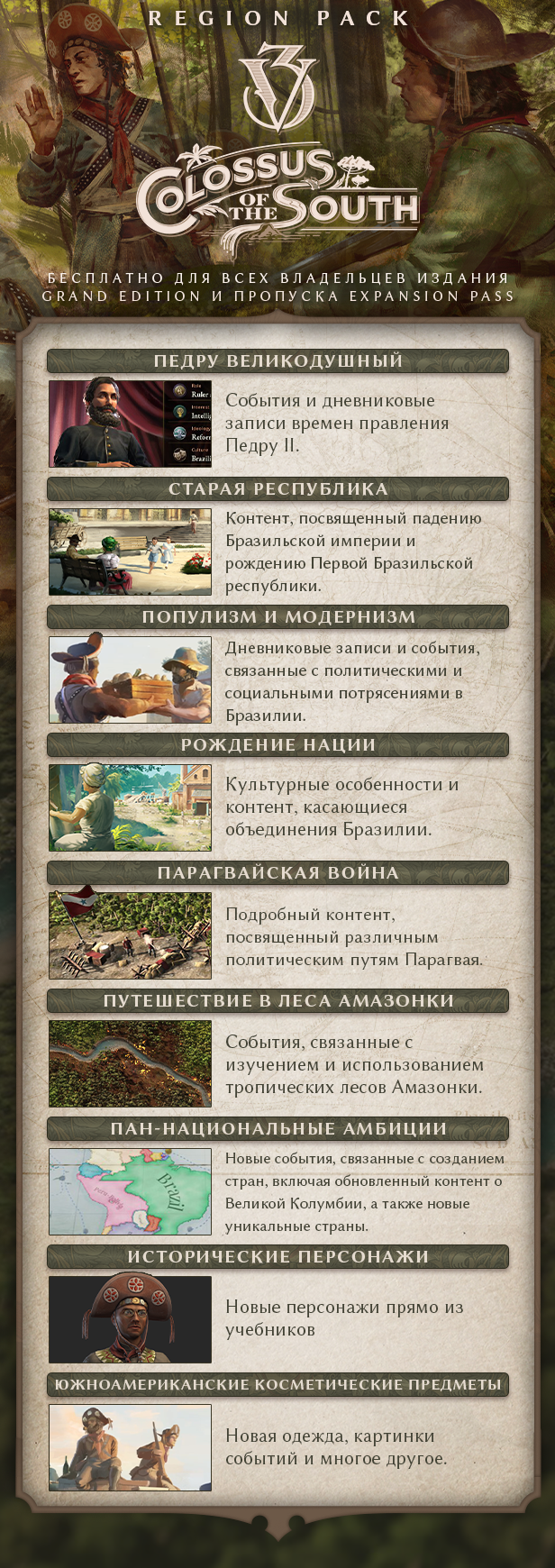 Также для Victoria 3 подготовили дополнение Colossus of the South. За него придётся заплатить, если не покупалось издание Grand Edition или Expansion Pass. В центре внимания Южная Америка: новые события, записи в журналах и особенности многих стран региона.