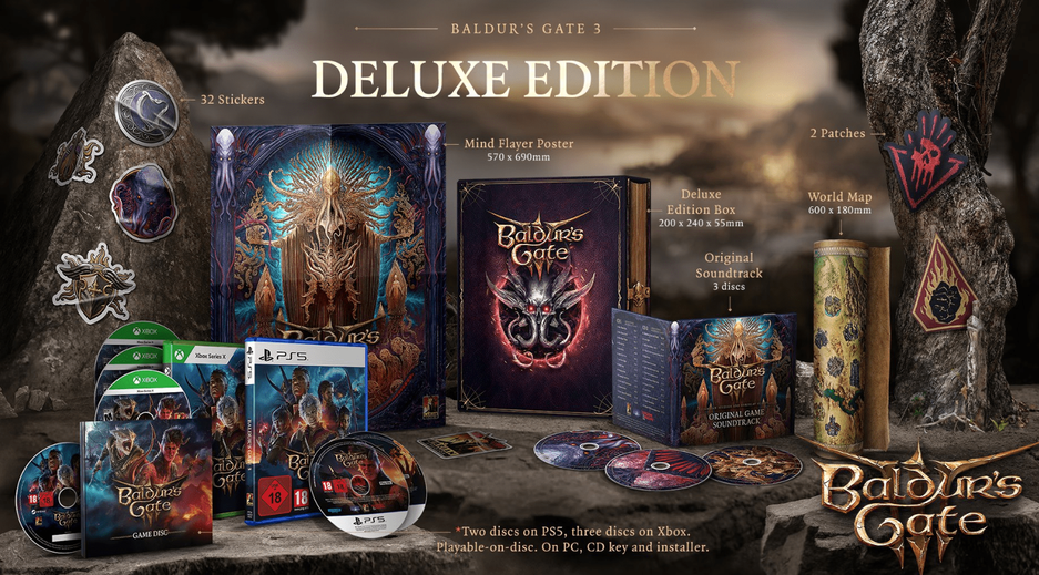 Будут распространять Baldur's Gate 3 Deluxe Edition. В наличии не только сама игра, но и различные бонусы: карта, саундтрек, постер, стикеры и наклейки.