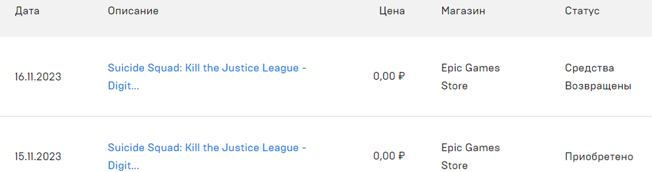 Затем администрация EGS всё переиграла: Suicide Squad Kill the Justice League начали забирать с аккаунтов, а в истории транзакций пишут о том, что «Средства возвращены» (получалось всё бесплатно, т.е. вернули целых 0 рублей 00 копеек). Это далеко не первый раз, когда в магазине с пониженной комиссией для разработчиков происходят чудеса с ценами.