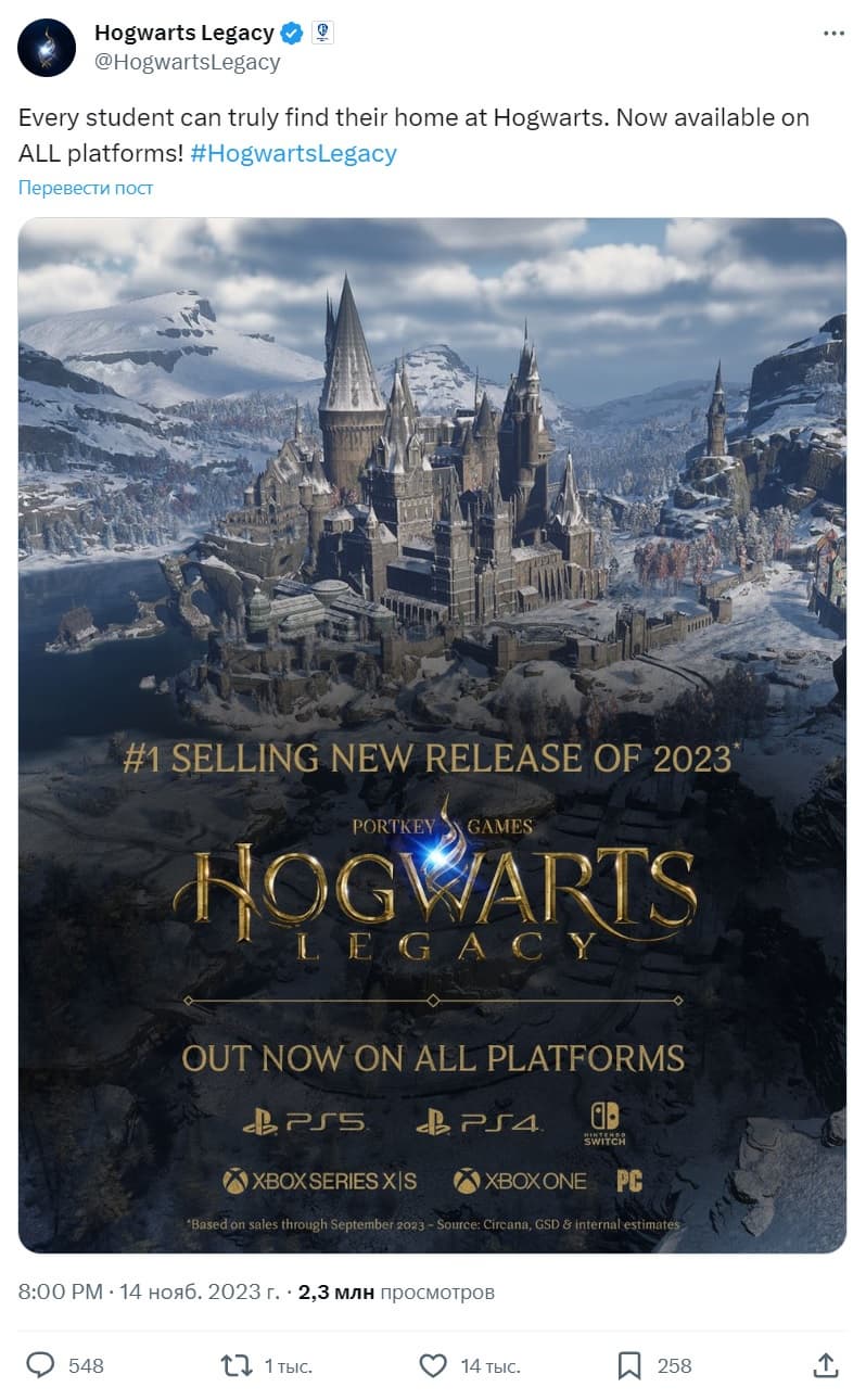 Согласно официальному Twitter-аккаунту Hogwarts Legacy стала самым продаваемым релизом 2023 года.