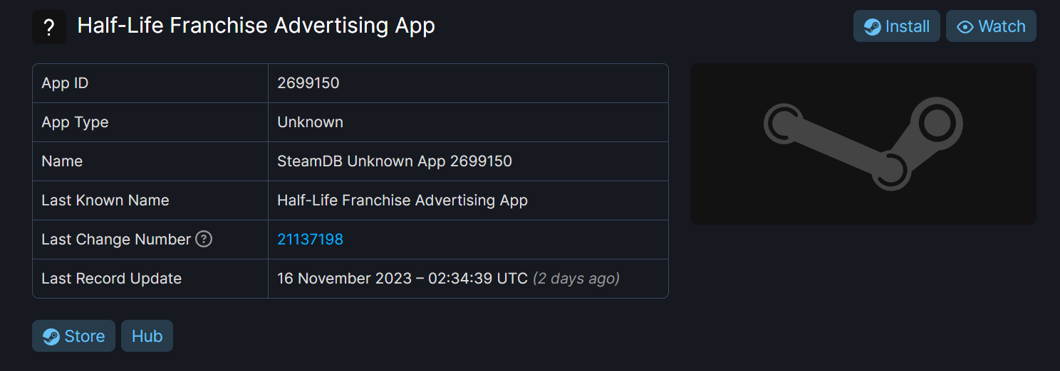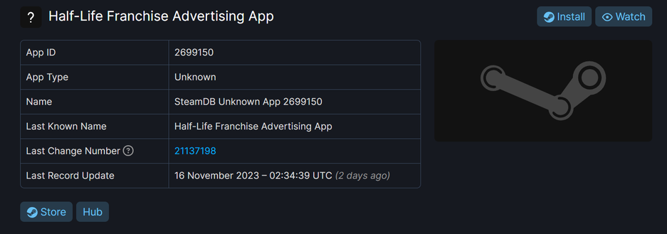 Теперь внимание приковано к странице в Steam, связанной с франшизой Half-Life. В базе SteamDB нашли упоминание Half-Life Franchise Advertising App (Приложение для рекламы франшизы Half-Life). SteamDB зарегистрировал обновления 15-16 ноября.