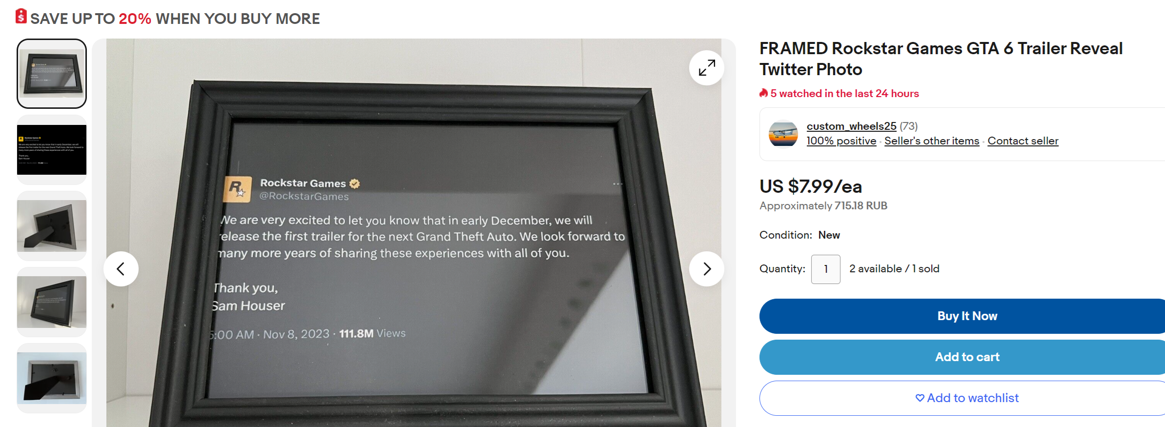 Недавно на просторах eBay появилось примечательное предложение. Предприниматель догадался взять скриншот поста Rockstar Games с анонсом трейлера следующей GTA, распечатать, вставить его в рамку и выставить на аукцион.