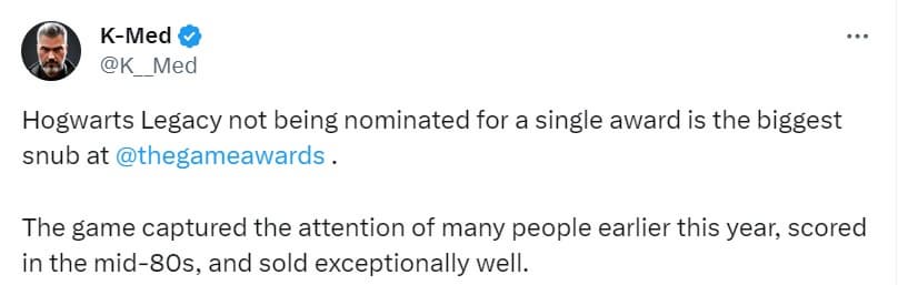 Ежегодно Game Awards отмечает лучшие игры индустрии, присуждая им награды в различных категориях. Hogwarts Legacy стала самой продаваемой игрой 2023 года, но не номинирована ни в одной.